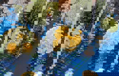 Sky blue Essential napkin, white Essential linen & gold trim charger
