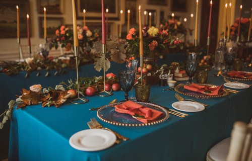 © 88 Events - Teal Essential linen, burnt orange Gelato napkin, gold Petal charger, amber goblet & gold trim glasses