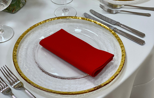 © 88 Events - White Essential linen, red Essential napkin & gold trim charger