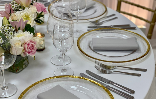 © 88 Events - Stone Essential napkin, white Essential linen & gold trim charger