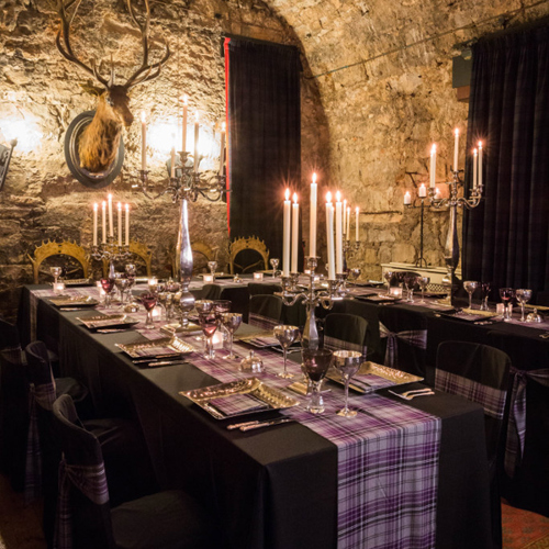 © 88 Events - Red Essential chair covers, black Essential linen, Royal Stewart Tartan runner & wrought iron candelabra