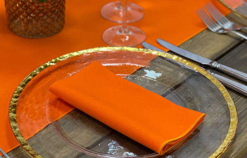 © 88 Events - Orange Essential table runner & napkin, gold trim charger & rustic table