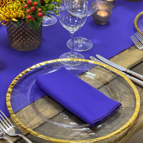 Purple Essential table runner & napkin, gold trim charger & rustic table
