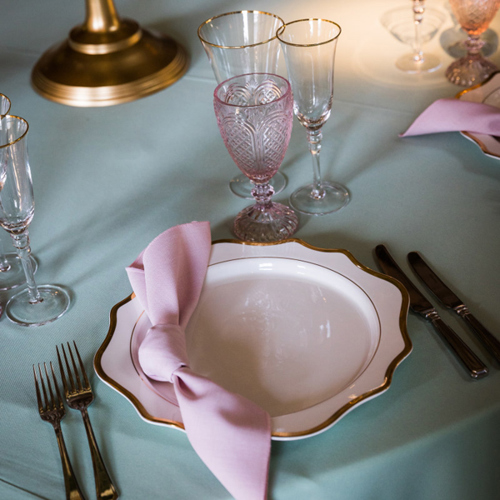 Sage Essential linen, peony Gelato napkin, gold Porcelain charger, pink goblet & gold trim glasses