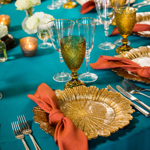 Burnt orange Gelato napkin, teal Essential linen, gold Petal charger, amber goblet & gold trim glasses