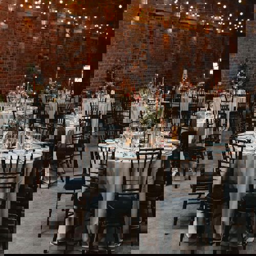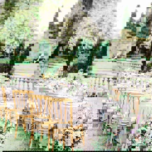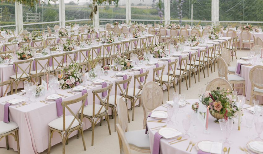 © 88 Events - Gentle lavender Gelato linen, blackcurrant Gelato napkin, Crossback chair with blackcurrant Gelato pad