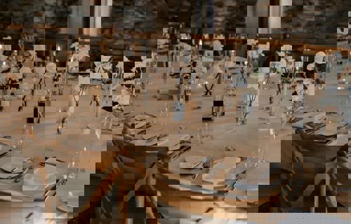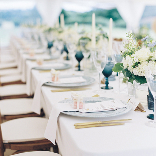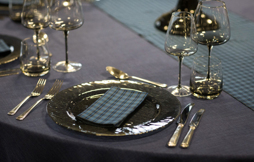 © 88 Events - Denim Gelato linen, Barra Tartan napkin & runner & smoke grey glasses