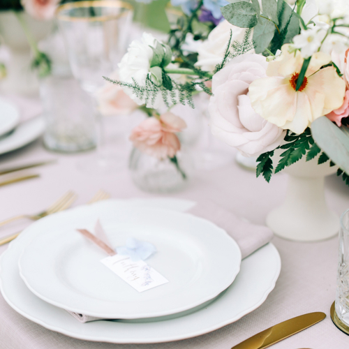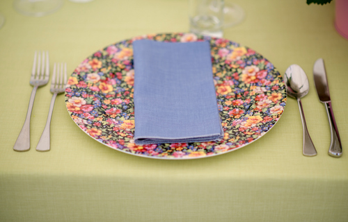 © 88 Events - Pistachio Gelato linen, violet cream Gelato napkin & floral china charger plate