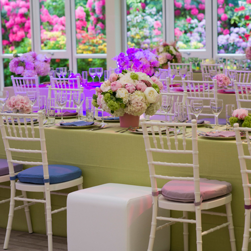 © 88 Events - Pistachio Gelato linen, white cube, ivory Chiavari chairs with violet cream & wild berry Gelato pads
