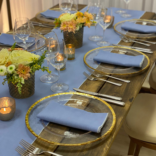 © 88 Events - Denim Gelato napkin & runner, gold trim charger plate & rustic table