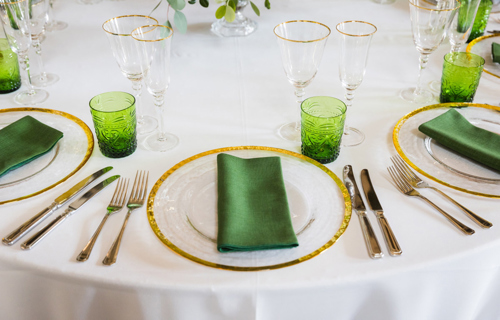 © - Evergreen Gelato napkin, white Essential linen, gold trim charger, green water glass & gold trim glasses