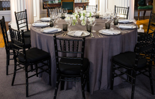 Graphite Gelato linen, silver Petal charger, smoke water glass & black Chiavari chair