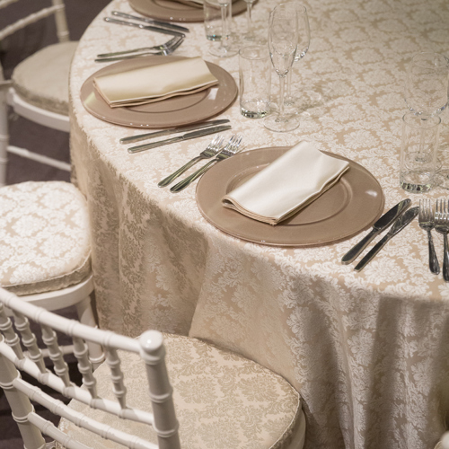 Sand Milano linen & napkins with gold Chiavari chairs & cream Essential pads