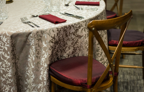 © 88 Events - Latte Monaco linen, wine Essential napkins & Crossback chairs with burgundy Taffeta pads