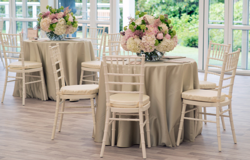 Sand Milano linen with ivory Chiavari chairs & vanilla Milano pads