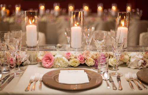 Sand Milano linen, gold trim charger plates & gold candelabras