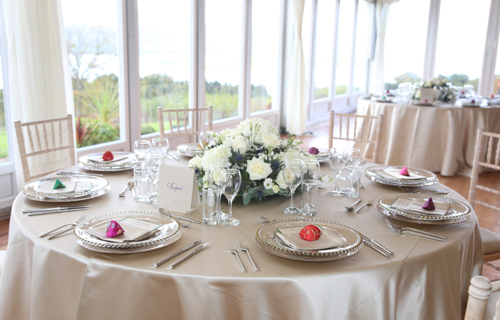 © 88 Events - Sand Milano linen with latte Monaco chair covers, latet charger plates & Swirl glasses