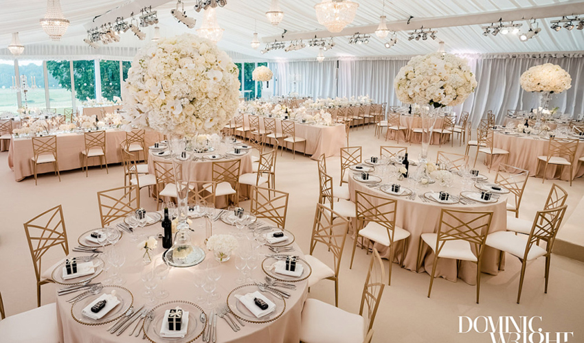 Latte St. Tropez linen, silver Beaded chargers & gold Chiavari chairs with cream pads