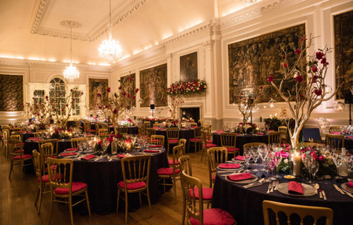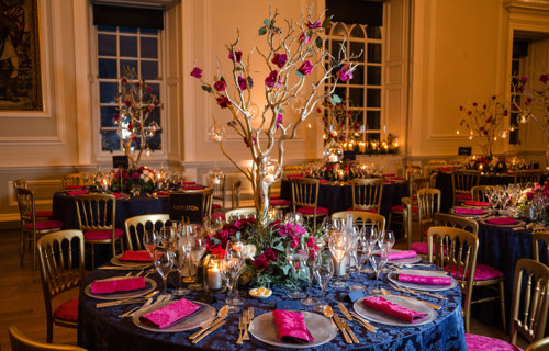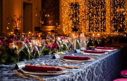 © @blueskyphoto - Navy Damask linen with raspberry Damask napkins & seat pad covers