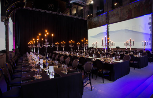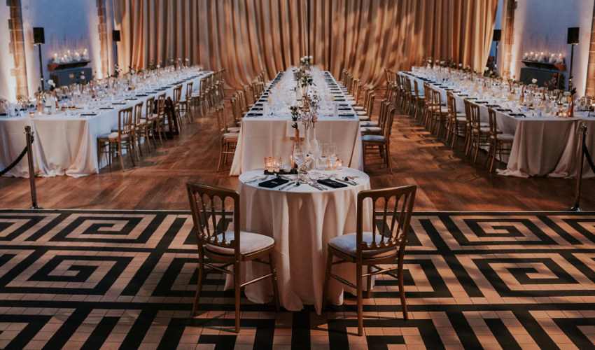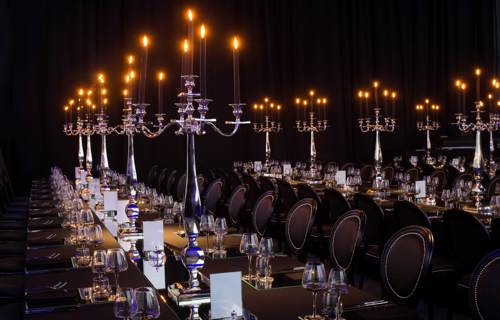 Silver square base candelabras, black Essential linen, smoke grey glasses & black French chairs