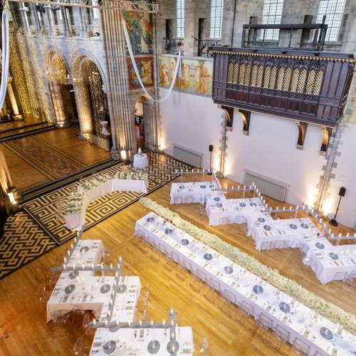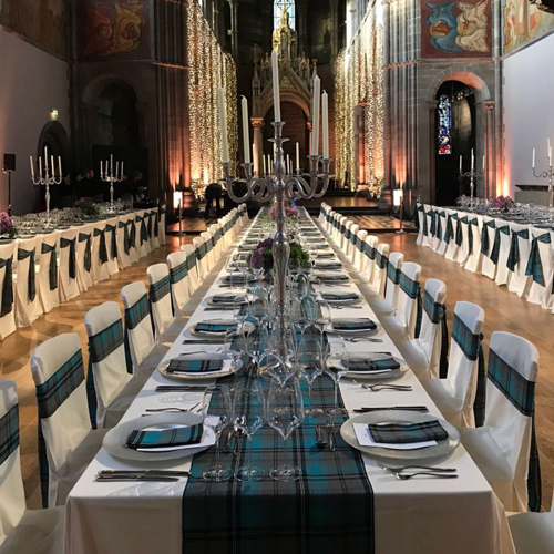 © Heritage Portfolio - White Essential linen & chair covers with Eilidh Tartan napkins & runners, silver chargers & candelabras
