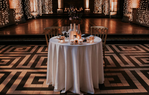 White Essential linen & chair covers with Eilidh Tartan napkins & runners, silver chargers & candelabras