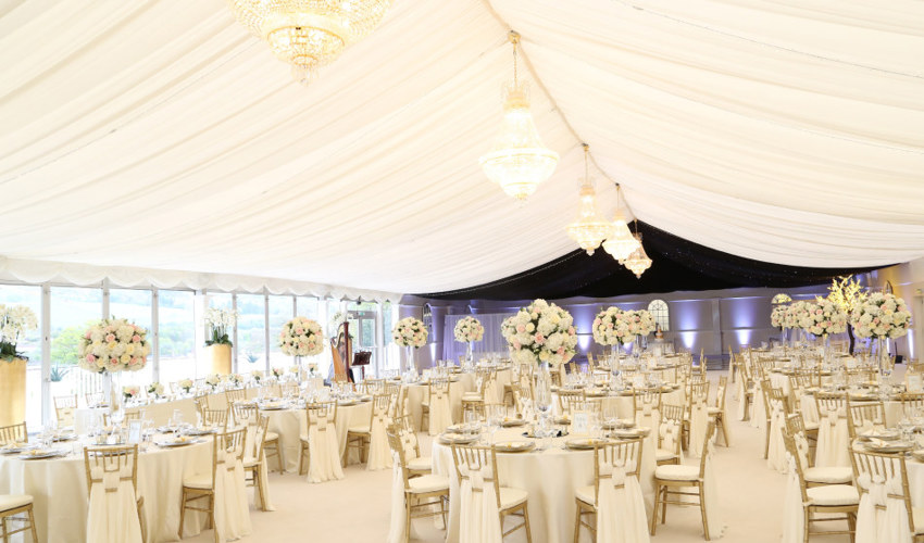 Champagne Faux Silk linen, gold beaded charger plates & gold Chiavari chairs with Santina weaves