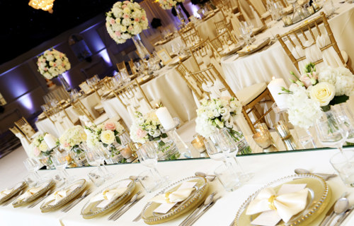 Latte St. Tropez linen, sand Milano napkins, gold beaded chargers & gold Chiavari chairs