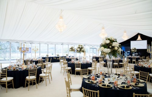 Navy Essential linen & napkins, gold chargers & gold Chiavari chairs with white pads