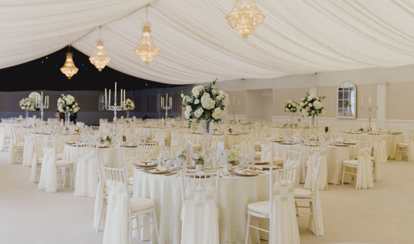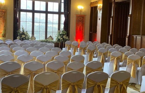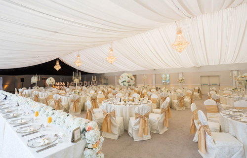 © 88 Events - Cream Damask linen & chair covers with champagne Faux Silk ties