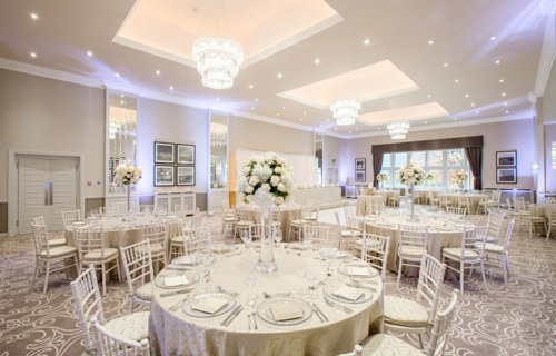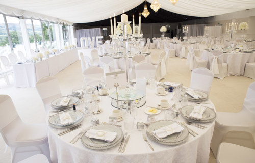 © @kksnaps_scotland - White Damask linen with white Italian stretch chair covers & silver beaded chargers