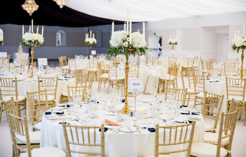 Cream Damask linen & pads on gold Chiavari chairs with gold candelabras