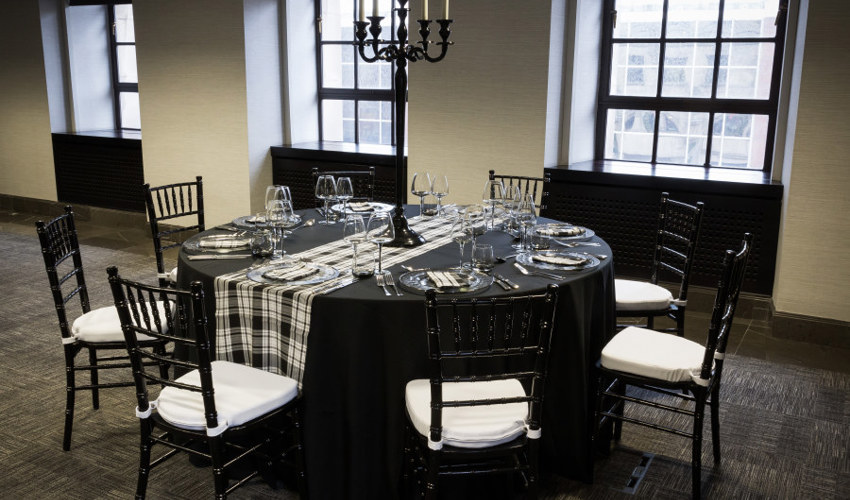 Black Essential linen, black Chiavari chairs with white Essential pads, Menzies Tartan runner & black candelabra