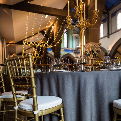 © 88 Events - Crossback chairs with cream Essential pads & linen & gold trim chargers