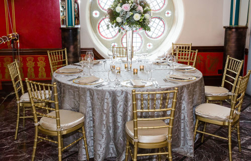 Graphite Gelato linen with gold Chiavari chairs and gold candelabra