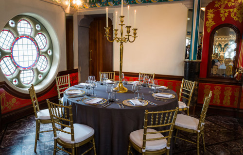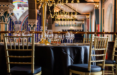 © 88 Events - Noir Verona linen & pads on gold Chiavari chairs with gold candelabra