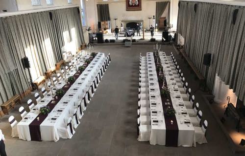 Damson Damask linen & cream Damask chair covers with silver candelabras