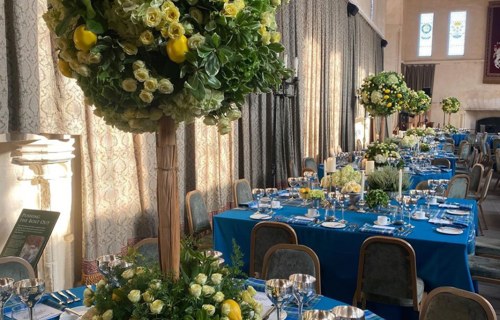 © Planet Flowers - Slate grey Damask linen, petwr goblets, smoke grey glasses & Crossback chairs