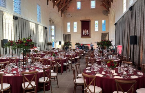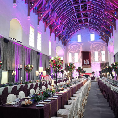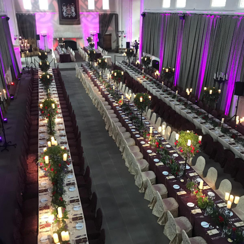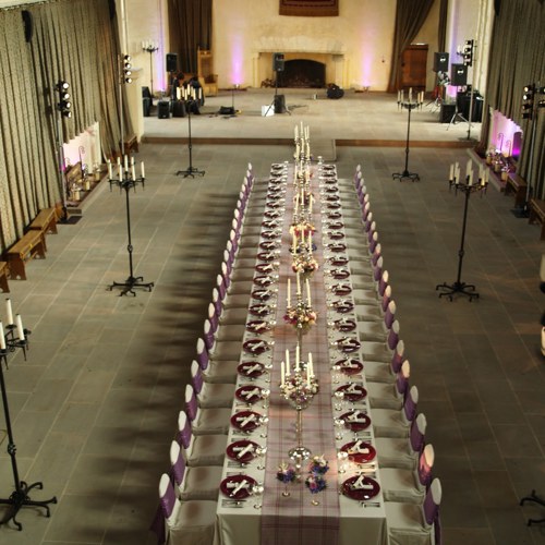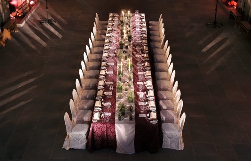 © The Turner Agency - Desert Sand linen & chair covers, damson chargers & silver candelabras