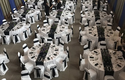 © 88 Events - Slate grey Damask linen & purple pout Damask chair covers