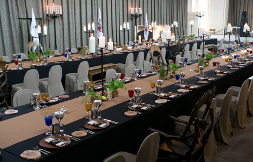 Black Chiavaris with Slate grey Damask linen & silver candelabras