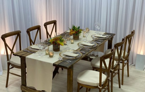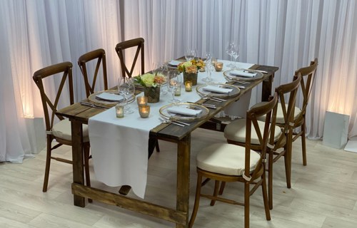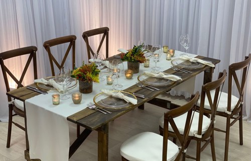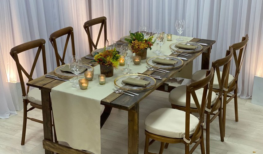 © 88 Events - Coconut Gelato runner & napkins with gold Trim chargers on Rustic table