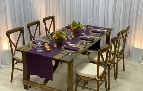 © 88 Events - Blackcurrant Gelato runner & napkins with gold Trim chargers on Rustic table