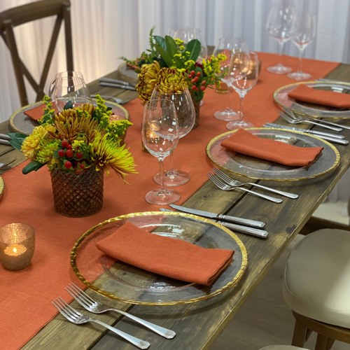 Burnt orange Gelato runner & napkins with gold Trim chargers on Rustic table