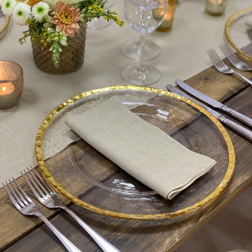 © 88 Events - Biscuit Essential runner & napkins with gold Trim chargers on Rustic table
