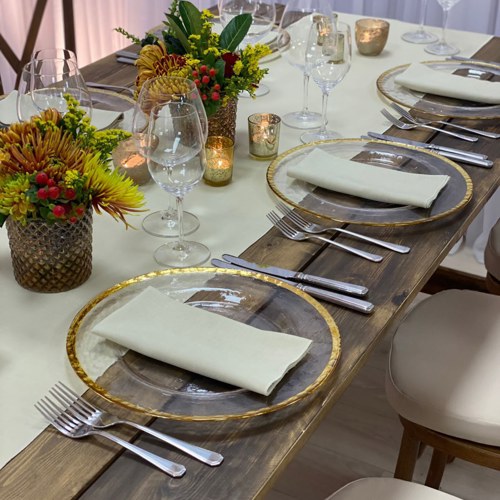 © 88 Events - Wine Essential runner & napkins with gold Trim chargers on Rustic table