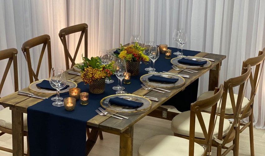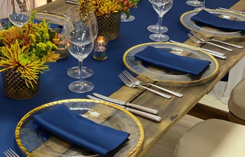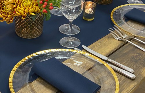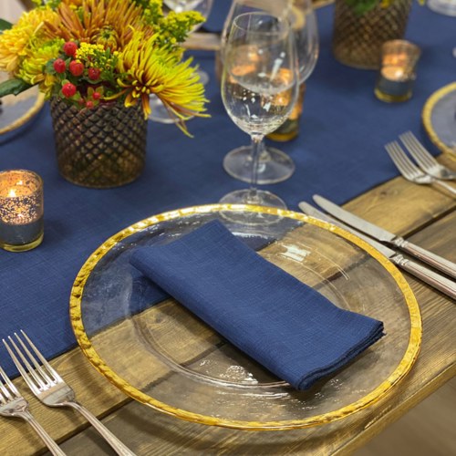 © 88 Events - Navy Essential runner & napkins with gold Trim chargers on Rustic table