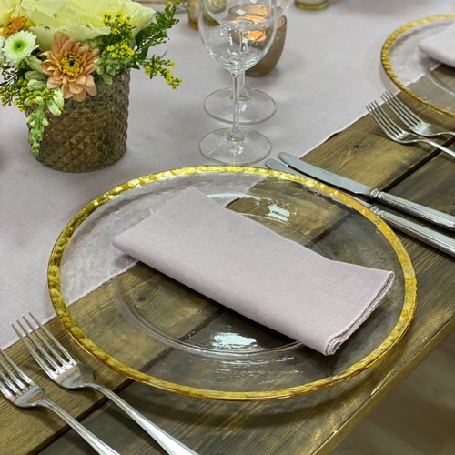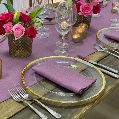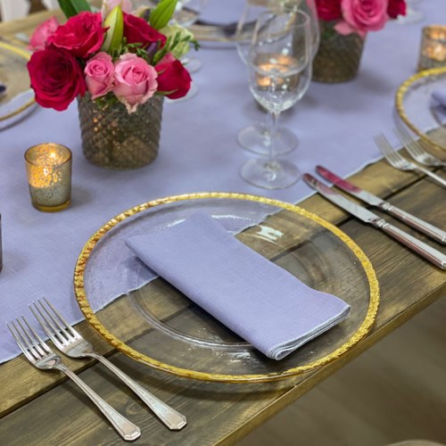 Gentle lavender Gelato runner & napkins with gold Trim chargers on Rustic table