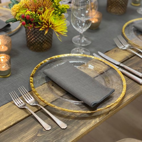 © 88 Events - Graphite Gelato runner & napkins with gold Trim chargers on Rustic table