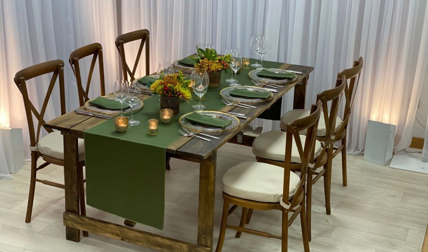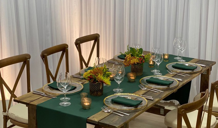 © 88 Events - Green Essential runner & napkins with gold Trim chargers on Rustic table